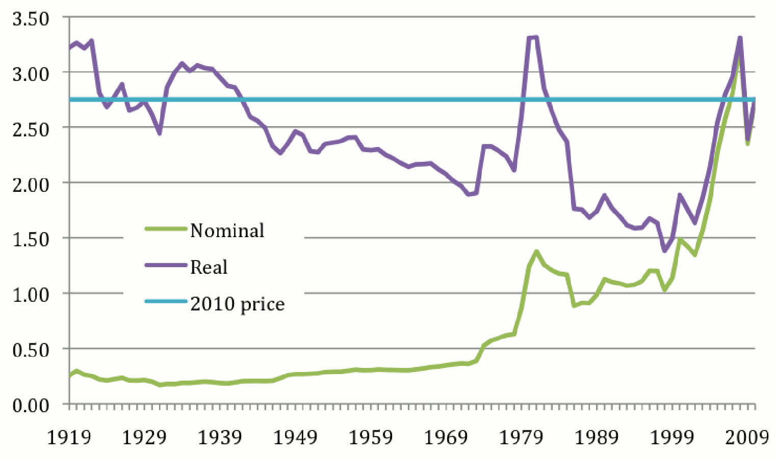 Whether the price at the pump has gone up or down depends on the time scale considered and whether one looks at nominal or real dollars (adjusted for inflation). Over a nearly 100 year period (1919-2010) the real price of gasoline at the pump has decreased by about 15%. However, over a shorter period of time (1990-2010) the real price has increased by nearly 45%. The following two charts show how the price of gasoline has fluctuated over both the long-term and short-term timeframes.