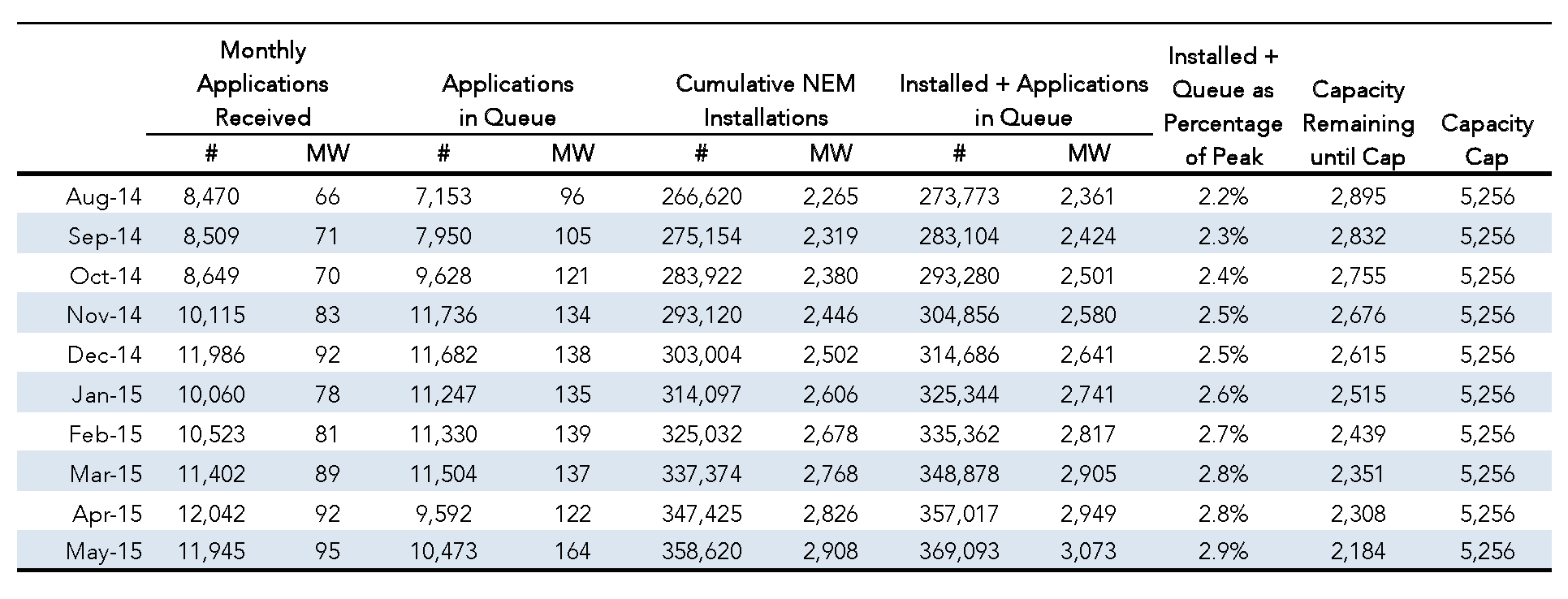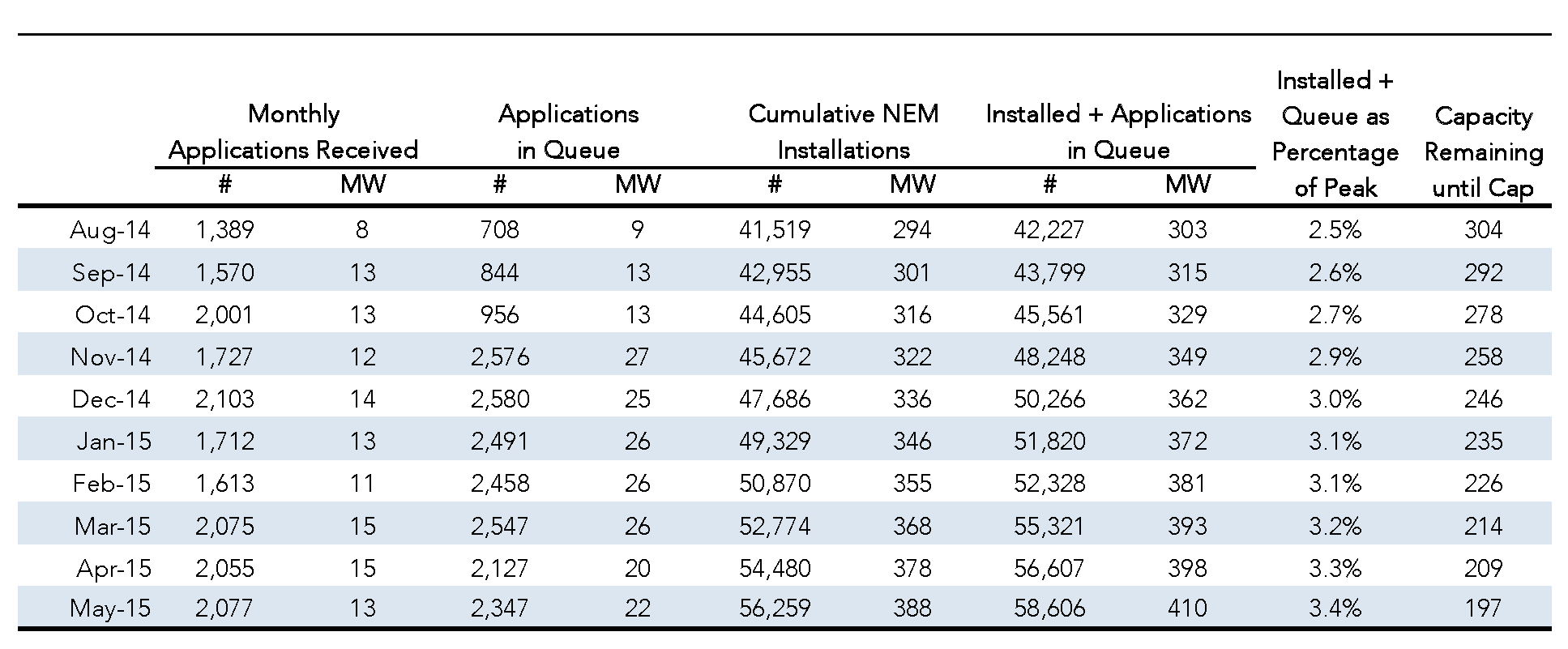 Currently there are 56,259 net energy metered systems installed in the SDG&E service territory representing 388 MW. There are also 2,347 systems representing 22 MW in the queue for interconnection. If we count those too, this leaves about 197 MW to reach the cap of 607 MW. Each month the total capacity of systems installations and applications in the queue totals about 12 MW. If this pace continues, we would hit the cap in October 2016.